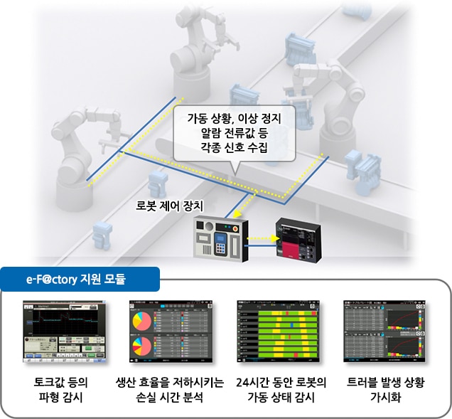 | 로봇의 가동 상황을 감시하여 트러블 예방 보전을 실현하고 싶다. | 로봇의 가동 상황을 e-F@ctory 지원 모듈로 가시화 |