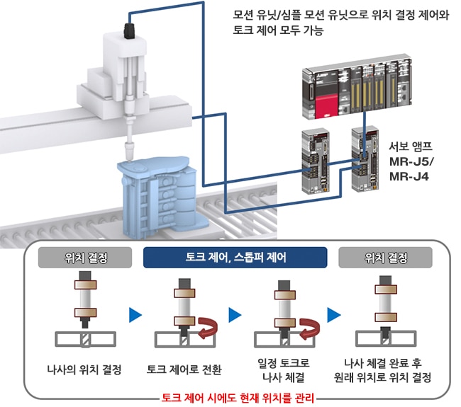 - 모션 유닛/심플 모션 유닛의 스톱퍼 제어를 통해 위치 제어를 정지하지 않고 원활하게 토크 제어로 전환할 수 있습니다.