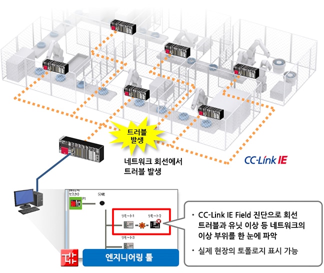 - CC-Link IE Field 진단을 통해 네트워크 전체의 상황을 가시적으로 표시하여 트러블 발생 시 이상 부위를 바로 특정할 수 있어 다운 타임을 단축할 수 있습니다.