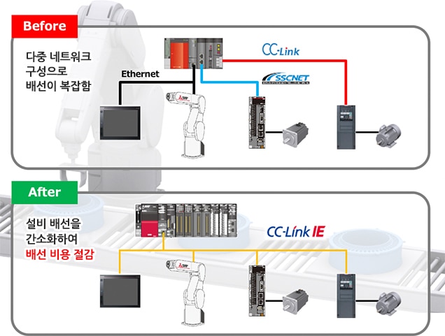 | 최적의 접속 구성으로 제어반 내 배선을 간소화하고 싶다. | CC-Link IE TSN/CC-Link IE Field에 통합 |