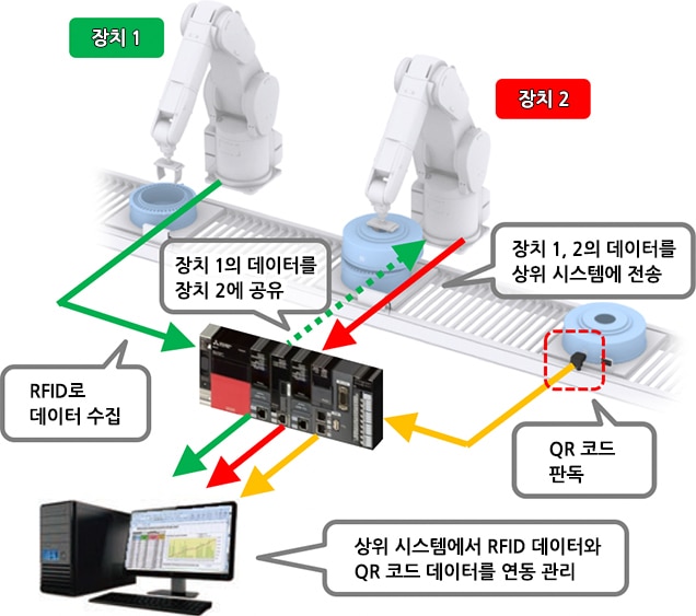| 장치 간 워크 정보를 공유하고 상위 시스템에서 관리하고 싶다. | RFID와 코드 리더의 정보 연결 |