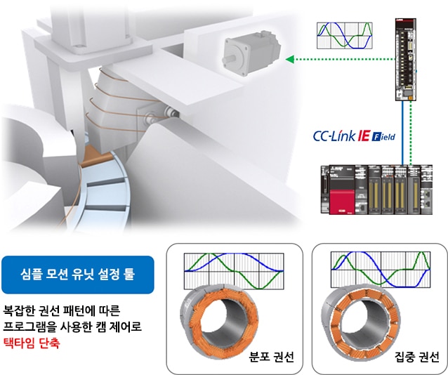 | 모터 권선 부분의 택타임을 향상시키고 싶다. | 캠 제어로 복잡한 권선 패턴에 대응하고 상황에 따라 변화 |