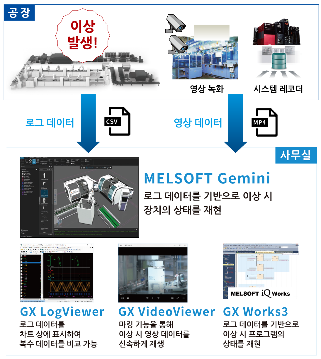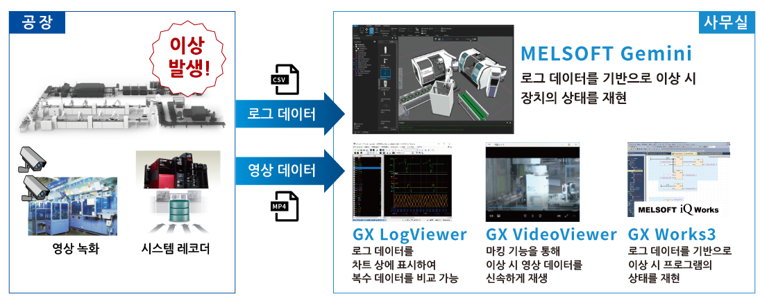 로그 데이터를 기반으로 MELSOFT Gemini 내에서 장치 동작을 재현할 수 있으며,