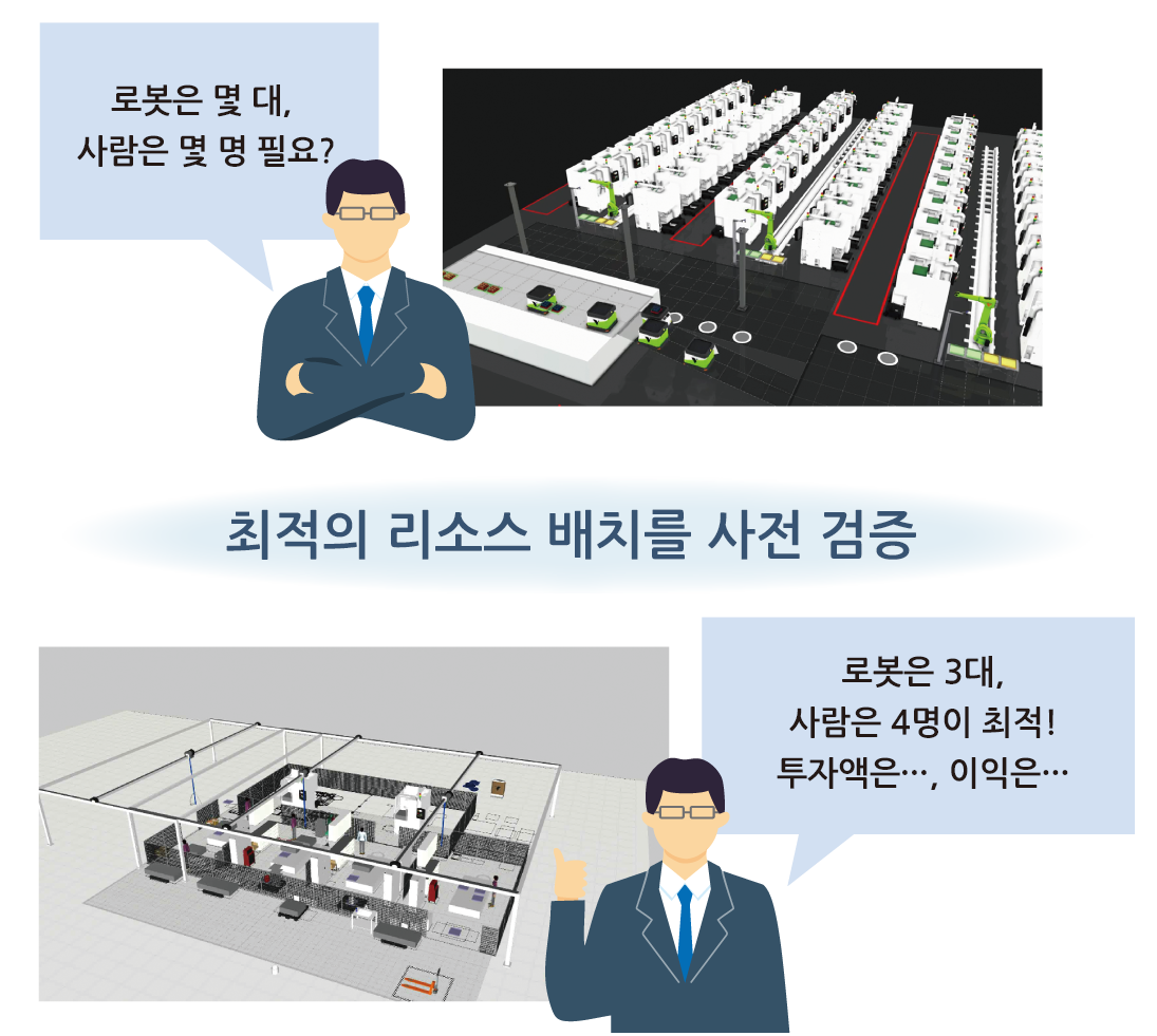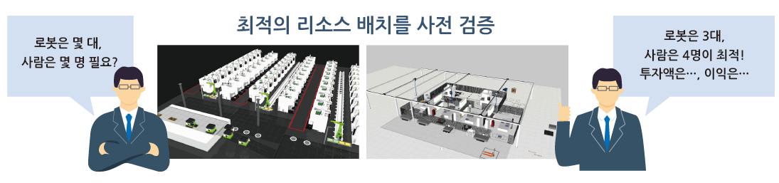 작업자를 몇 명 배치할지 책상 위에서 여러 패턴으로 검증하여 최적의 투자액 산정 가능.