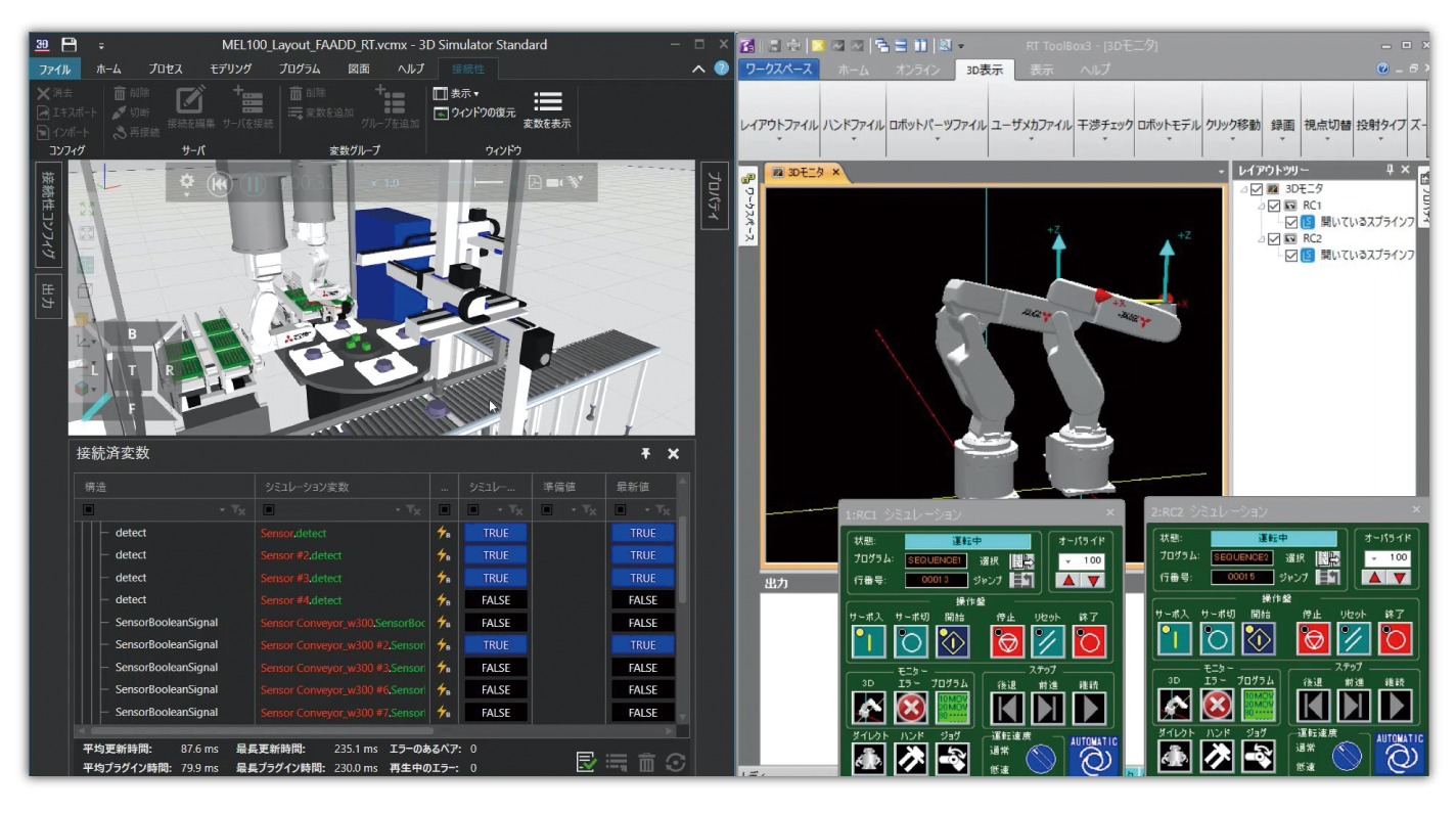 PLC와 로봇 등 엔지니어링 툴 및 미쓰비시전기 FA 기기와 연결하여 제어 로직을 3D 동작으로 확인 가능. 사전에 제어 실행 시 기계 간섭이나 로봇 동작 등의 문제점을 파악함으로써 현장에서의 엔지니어링 공수를 대폭 줄입니다.