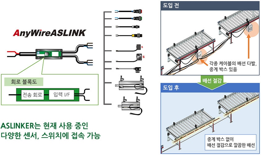 | 라인 셋업 공수 절감 | AnyWire ASLINK를 통해 배선 절약 및 중계 박스 제거, 오접속 감소, 라인 셋업 및 확장 용이 |
