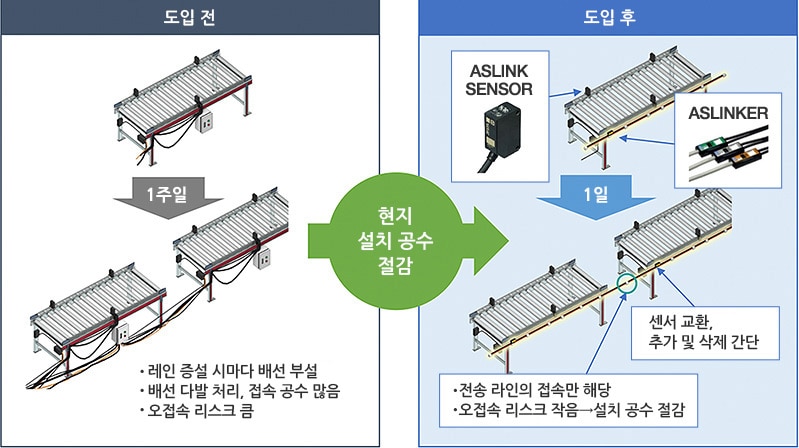 복잡한 센서선 접속과 배선 다발을 해소하여 라인 셋업 및 확장 용이