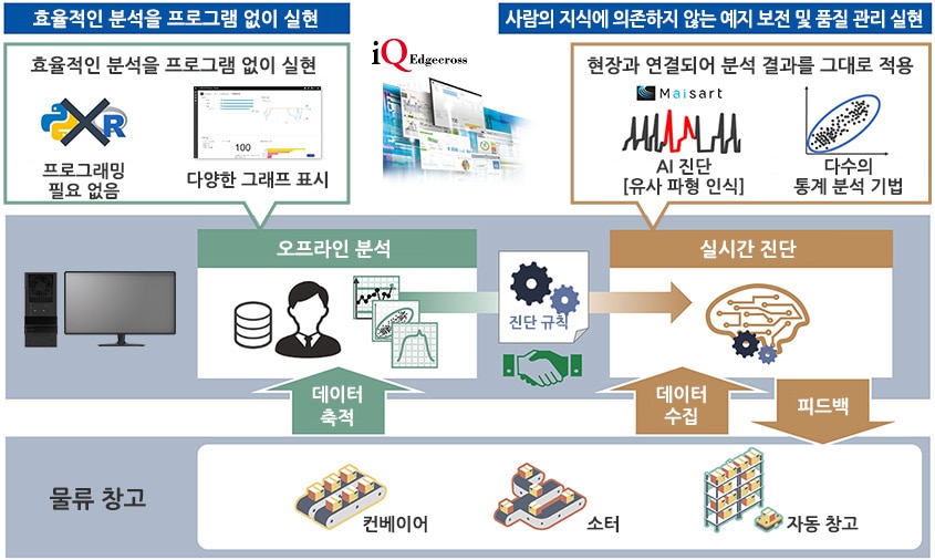축적된 데이터를 오프라인 분석하여 진단 규칙을 추출하고, 실시간으로 진단 결과를 현장에 피드백함으로써 예지 보전이 가능합니다.
