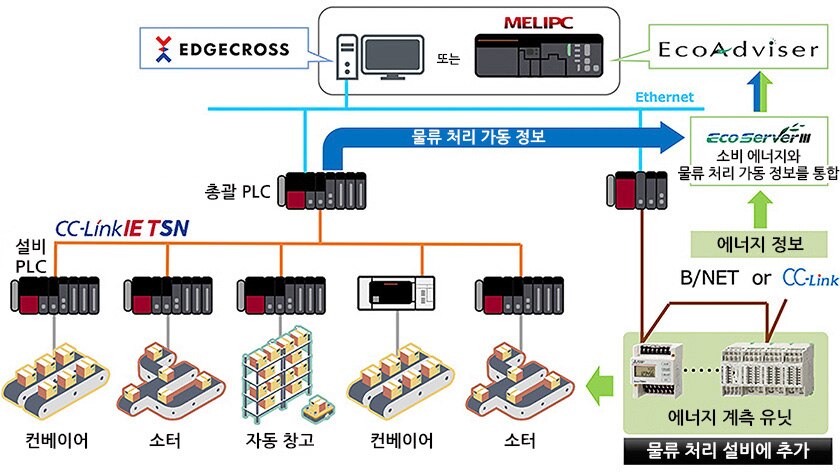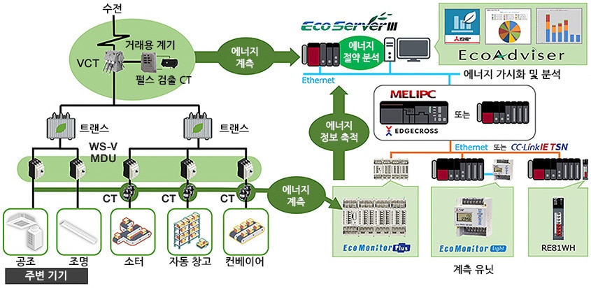 EcoServerⅢ로 머티리얼 핸들링 장치의 에너지 사용량과 가동 정보를 집약하고, EcoAdviser로 분석하여 설비 개선 및 운용 개선을 지원