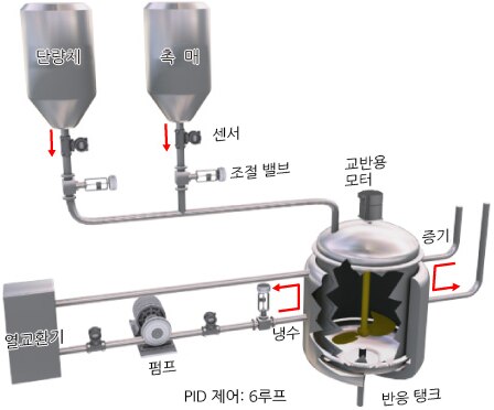 안정적인 반응을 얻기 위해 모노머/촉매의 적하 제어, 반응 탱크의 온도 제어를 실시하고 있습니다.