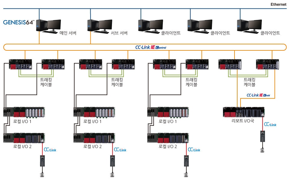 제철 공장의 각 공정 및 유틸리티의 감시 제어에 MELSEC iQ-R 시리즈, GENESIS64™, 표시기(GOT)를 제안합니다. CPU, 네트워크, SCADA 서버의 이중화를 통해 신뢰성 높은 시스템을 구축할 수 있습니다. CC-Link IE 컨트롤러 네트워크를 통해 PLC를 통합적으로 접속하고, 추가로 CC-Link IE 필드 네트워크를 통해 I/O를 분산 접속함으로써 네트워크를 계층화한 시스템 구축을 실현할 수 있습니다.