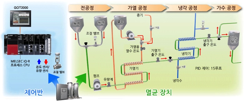 과즙을 연속적으로 살균하는 장치에 대한 적용 사례입니다. 가열기에서 정해진 유량으로 흐르는 과즙 원액을 열수에 의한 고온 증기를 사용하여 가열 살균합니다.