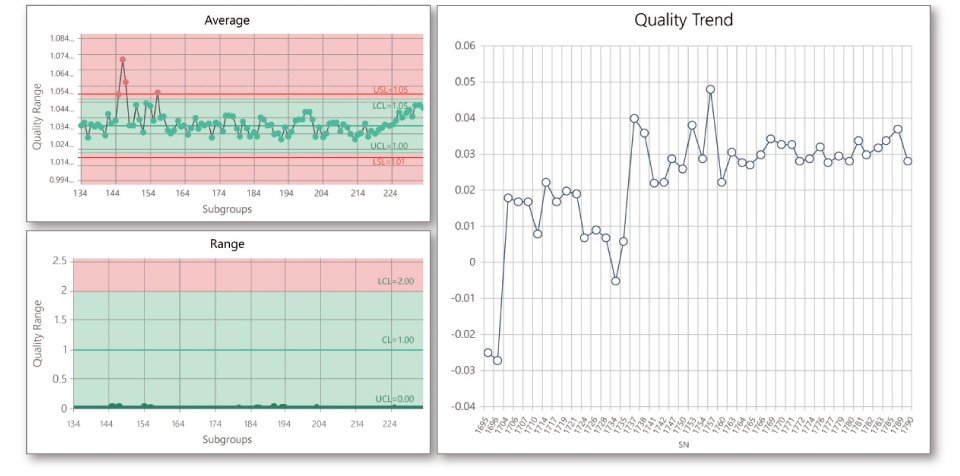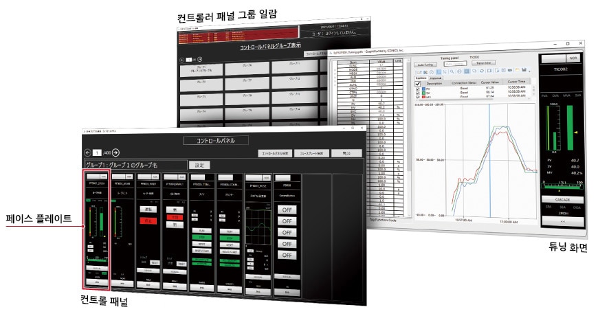 실시간 및 히스토리컬 트렌드에 대응합니다. 시스템 운용 중에 펜 추가 및 삭제, 표시 스케일 변경, 일시 정지, 표시 중첩 및 분할 등 트렌드 표시 형식을 변경할 수 있습니다.