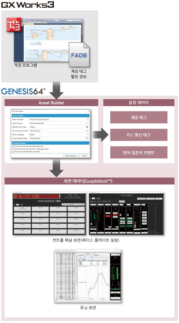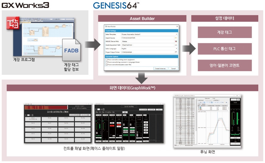 엔지니어링 소프트웨어 GX Works3로 작성한 계장 프로그램에서 화면과 통신 태그 등 필요한 설정이 자동으로 생성되어 즉시 사용할 수 있습니다. *1설정에 드는 공수를 줄일 수 있어 원활한 시스템 구축이 가능합니다.