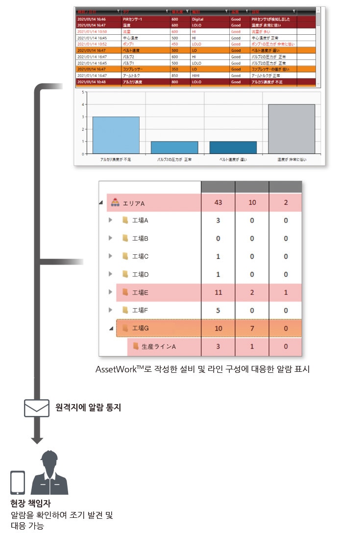 알람 및 이벤트를 알기 쉽게 표시하여 이상을 조기에 발견하고 대응을 지원합니다. 선택한 생산 라인 및 설비별 알람 수와 알람 상태 내역을 간단히 확인할 수 있습니다. 또한, 엔지니어링 소프트웨어 GX Works3의 계장 태그 알람도 간단한 설정으로 확인할 수 있습니다.