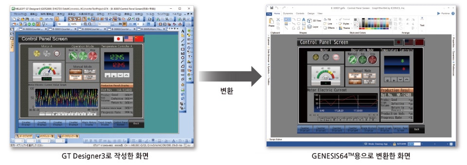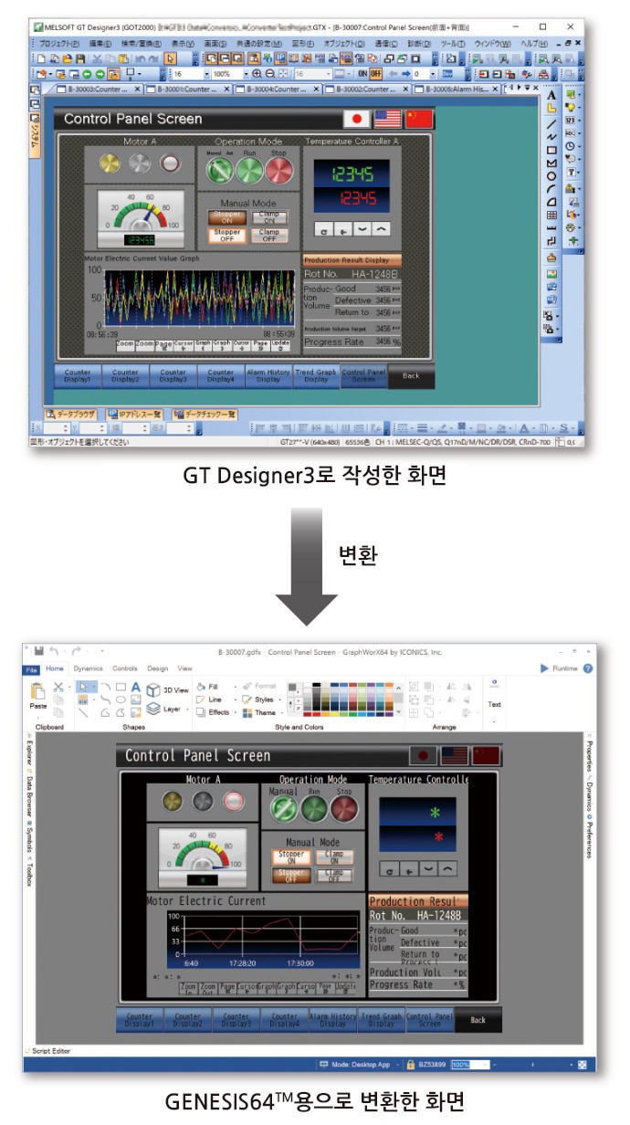 GT Designer3로 작성한 GOT용 화면 데이터를 GENESIS64™용 데이터로 변환할 수 있습니다. GENESIS64™용으로 별도 화면을 작성할 필요가 없어 엔지니어링 공수를 줄일 수 있습니다. 각 생산 현장에서는 GOT로 감시·조작하고, 사무실에서는 GENESIS64™로 원격 감시하는 시스템을 구축할 수 있습니다.