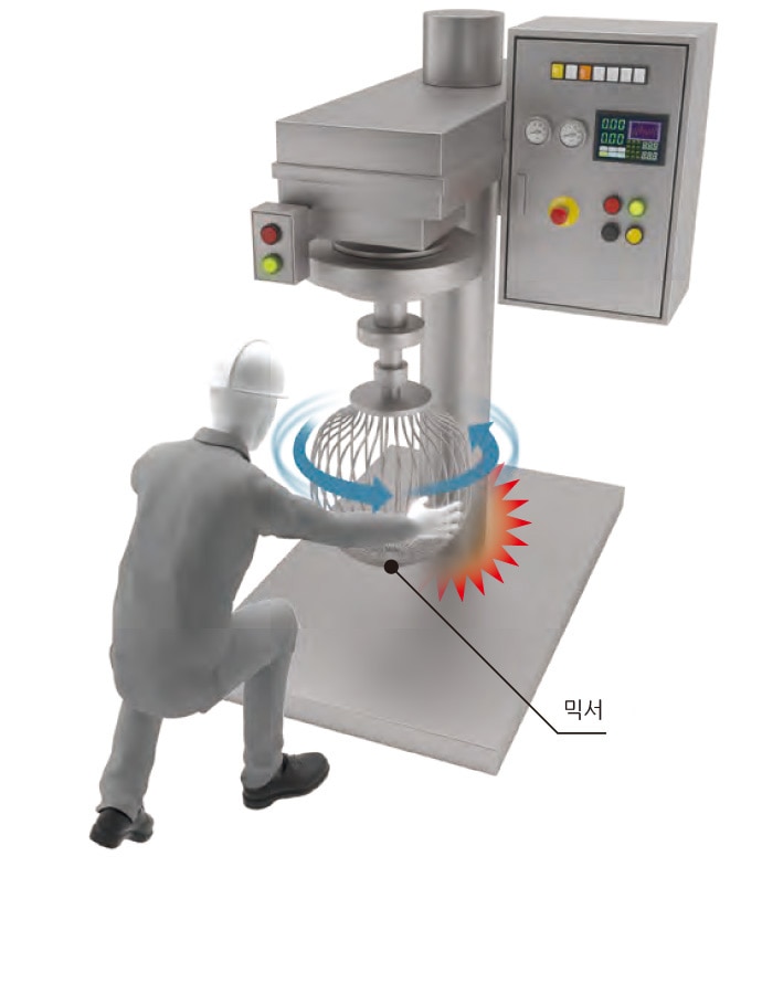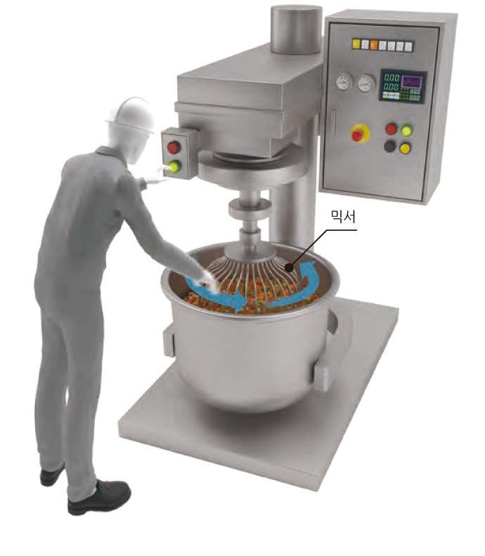제품의 완성 상태를 확인하거나 이물질을 제거하려고 손을 넣는 순간 믹서에 말려 들어갈 위험이 있습니다.