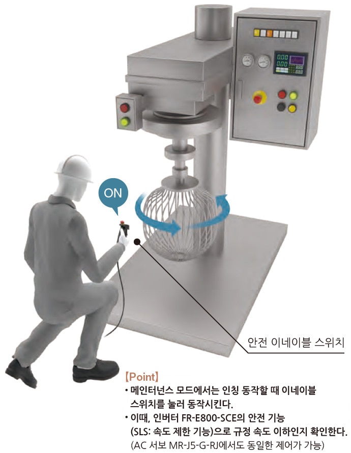 또한, 안전 구동 기기와 조합함으로써, 버튼을 누르고 있는 동안에만 저속으로 회전하는 홀드 투 런(Hold-to-Run)을 실현할 수 있습니다.