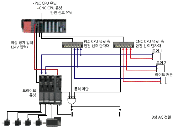 PLC CPU 유닛 및 CNC CPU 유닛의 2계통으로 입출력하는 안전 신호가 일치하는지 감시합니다.