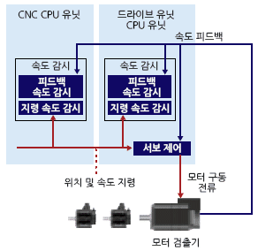 기계 보호 도어 개방 시 CNC CPU 유닛과 드라이브 유닛 CPU 유닛에서 지령 속도와 피드백 속도가 안전 속도를 초과하지 않는지 이중 감시합니다.