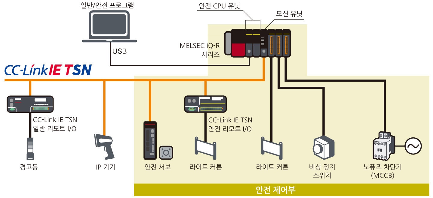 기존에는 일반 제어용 시스템과 안전 제어용 시스템으로 별도의 PLC나 네트워크를 구축해야 했지만, MELSEC iQ-R 시리즈 안전 PLC와 CC-Link IE TSN을 사용하면 일반과 안전을 하나의 시스템으로 통합할 수 있습니다. 이를 통해 공간 절약과 비용 절감을 실현할 수 있습니다.