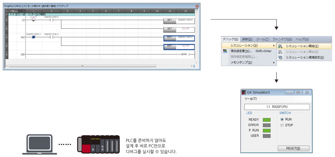 - CPU 유닛과 접속하지 않고도 디버그가 가능하므로, 프로그램을 실제 기기에서 동작시키기 전에 확인할 수 있어 편리합니다.