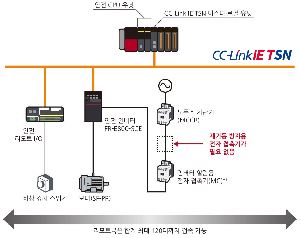 인버터 FR-E800-SCE는 안전 기능을 표준 탑재하고 있습니다. 일반 통신용 기기와 안전 통신용 기기를 별도로 준비할 필요가 없습니다.